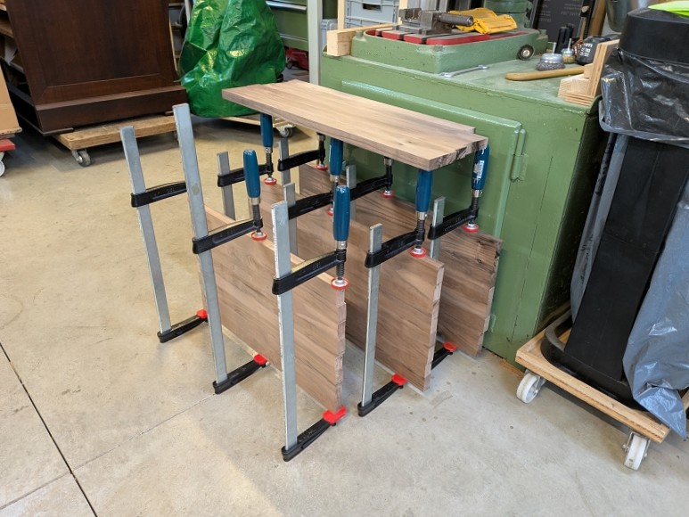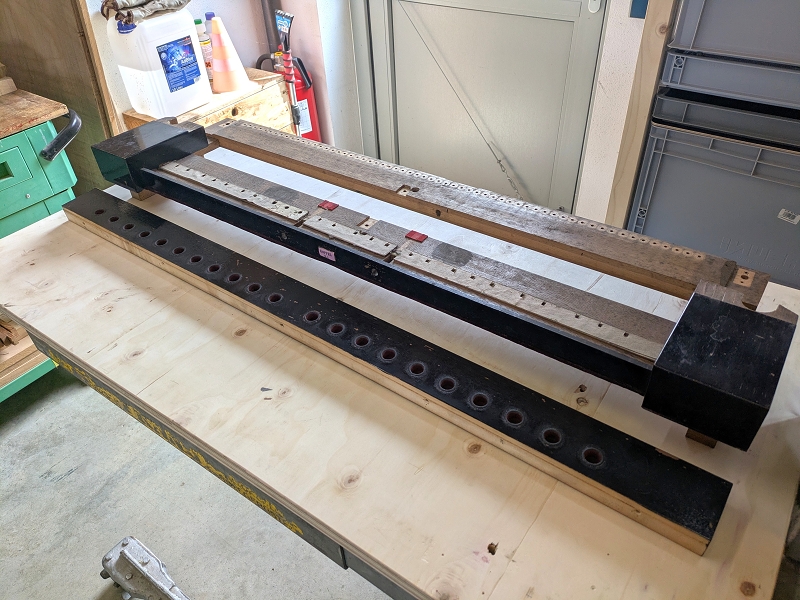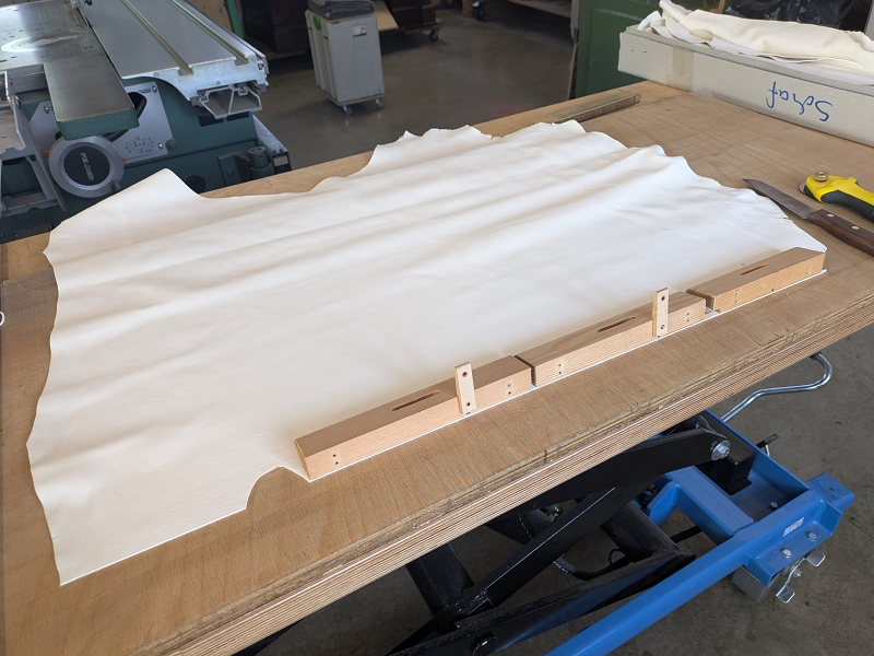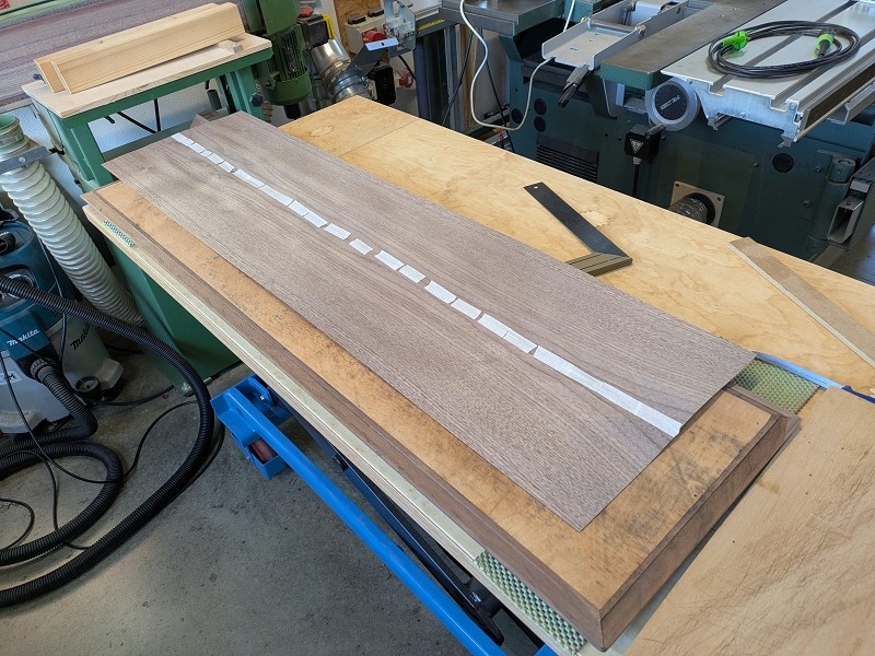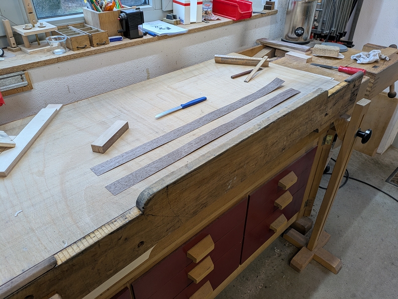 Zwei lange Furnierbahnen wurden zugerichtet und zusammengehängt, dann