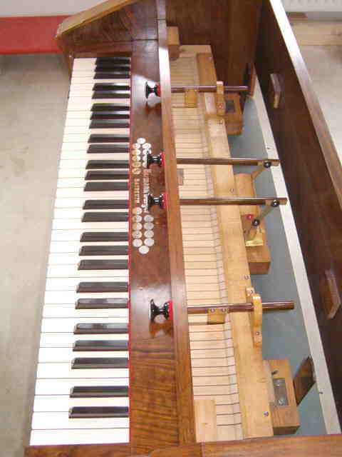 Hier ist das Meiste schon wieder eingebaut. Der Balg wurde gereinigt, dessen Lederteile gepflegt, die Dichtwulst zur Lade massiert und talkumiert, die Ventile gereinigt und ebenfalls talkumiert und der Klaviaturrahmen erhielt neue Filze. |