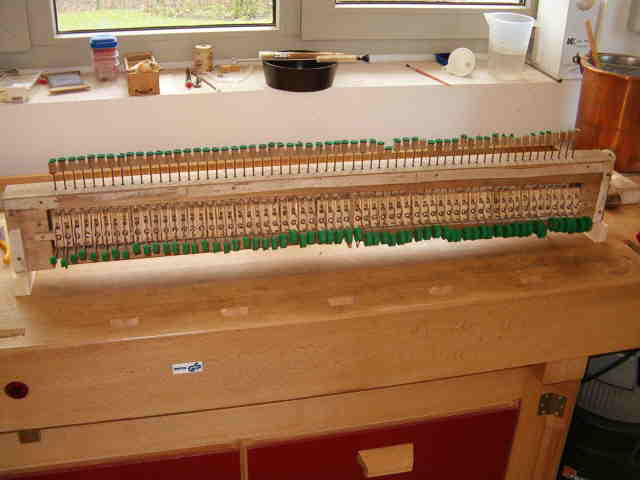 | Nach dem Aufsetzen der Klaviatur und der Registermechanik wurde die Perkussion regulier und alles gründlich auf 440 Hz gestimmt. |
