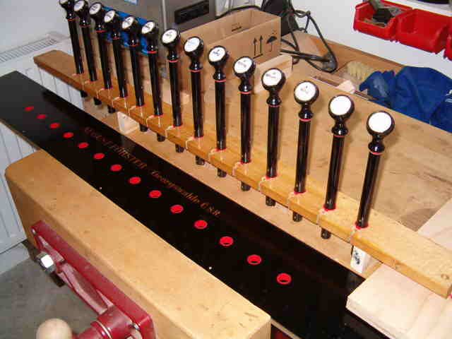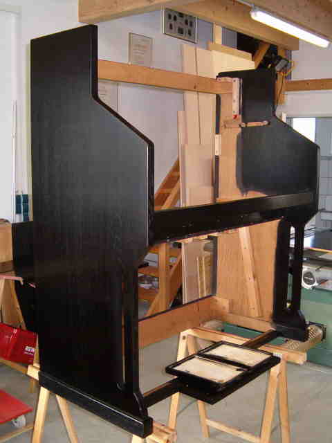 | Nach der Überarbeitung der schwarzen Oberfläche der Klaviaturabdeckung und des Registerbrettes erhielten die Führungen der Registerzüge neue Filzeinlagen. |