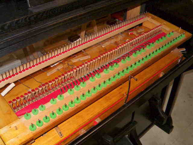 Hier sitzt das Werk schon wieder an seinem Platz und der Klaviaturrahmen wurde aufgesetzt. Wie immer wurden auch hier die Waag- und Führungsstifte entrostet und neue Filze aufgesteckt. |