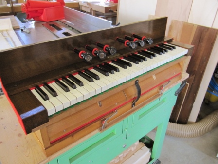 Das gesamte Instrument wurde in sämtliche Einzelteile zerlegt, alle Gehäuse-elemente anschließend mit Spiritus und Stahwolle entlackt, bevor dann alles frisch gebeizt wurde.