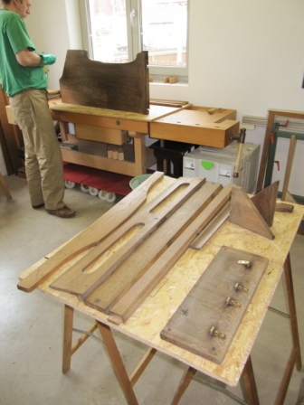Auf der anderen Seite der Ventile wurde die Oberfläche erneuert, neue Zungenfilze auf-geleimt und die Registermechanik gerichtet.