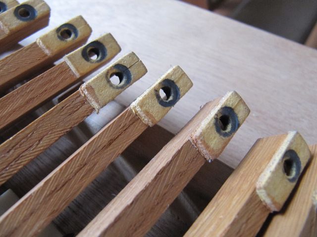 Die gleiche Prozedur erfuhren die langen Trakturwippen des II. Manuals. Zusätzlich wurden hier noch Konterungen mit weichem Filz angebracht, um ein Überschalgen zu verhindern.