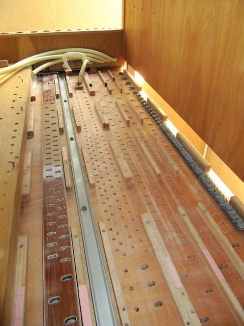 Sperrholz soweit das Auge reicht! Vom Gehäuse über die Raster, der Windlade und dem Balg, bis hin zu den Holzpfeifen.