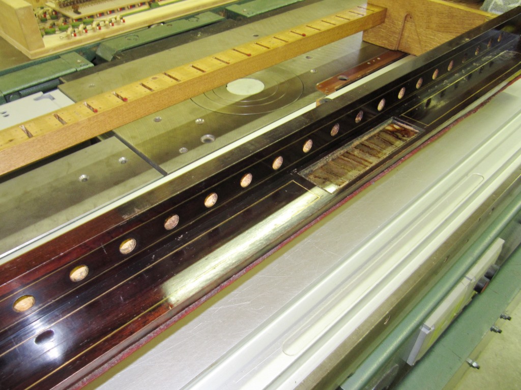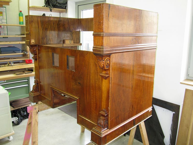 Hier sind die Gehäusearbeiten fast abgeschlossen. Der alte Nussbaum strahlt in den schönsten Farben!