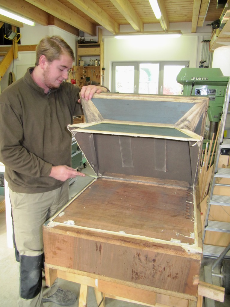 Trotz des äußerlich schlimmen Zustandes, hatte die Lade nur leichte Schäden davongetragen. Nach der Reinigung und Reparatur, wurde sie vorsichtig abgerichtet und lackiert.