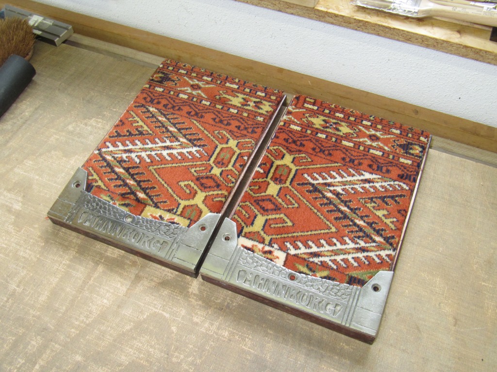 Hier werden gerade die originalen Kartonfalten auf der neuen Bespannung ausgerichtet und anschließend verleimt.