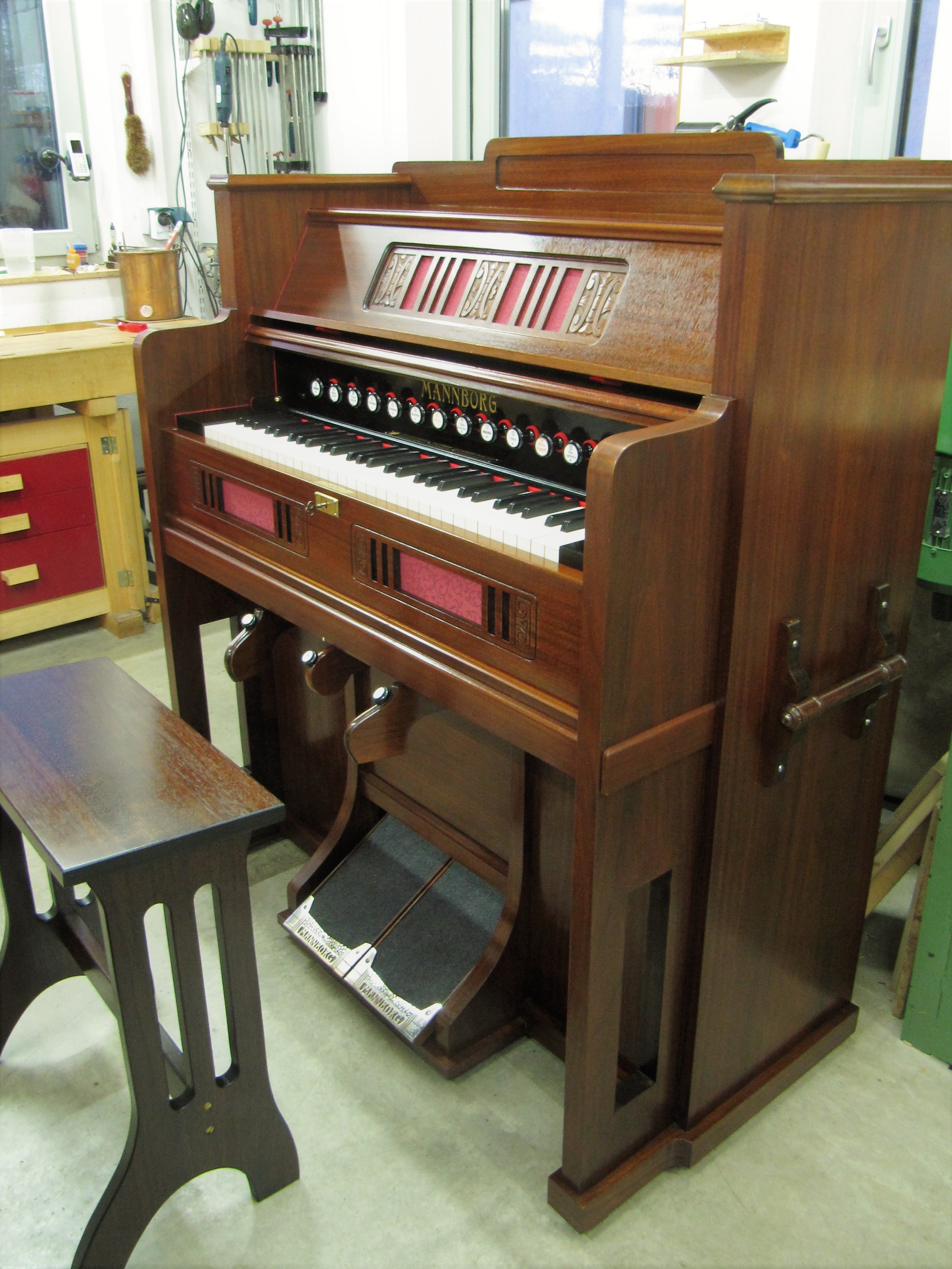 Nach dieser Überarbeitung ist das Instrument wieder wohnzimmertauglich. Die gut schließenden Forteklappen, ermöglichen eine wunderbare Dynamik. Gepaart mit der Pianissimo-Schaltung ergeben sich die unterschiedlichsten Register-Zusammenstellungen.