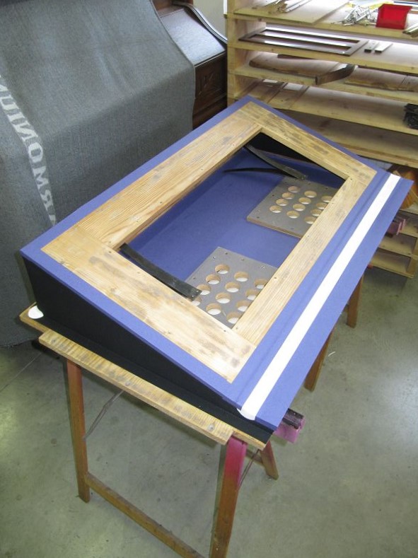 Hier ist die Montage schon weit fortgeschritten. Die Zungen sind eingeschoben, Mutzen gesetzt und ausgerichtet, es läuft der Einbau der Registermechanik und Forteklappen.
