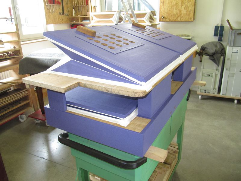Hier wird schon der Klaviaturrahmen für das Aufsetzen auf die Lade vorbereitet.