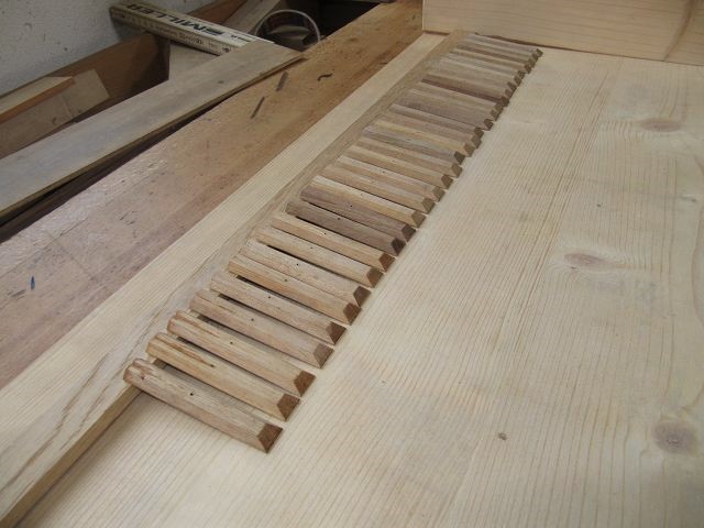 Als nächstes wurde die Ventillade in Angriff genommen. Diese sitzt unmittlbar unter dem Klaviaturrahmen. Die Verbindung zwischen Taste und Ventil, stellen Fäden her.