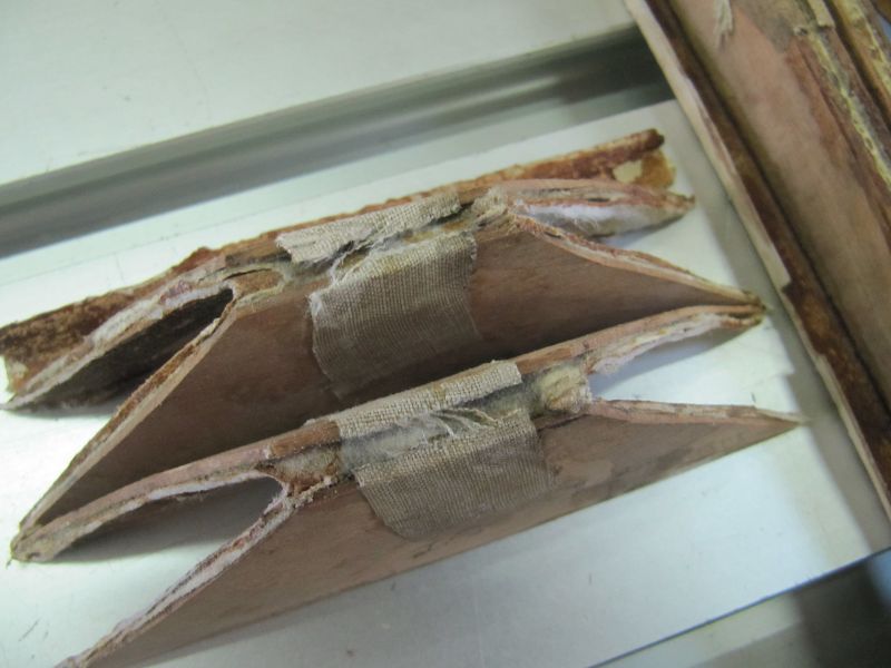 Nach dem Ablösen der Lederschichten, kamen die Holzfalten zum Vorschein. Das sehr dünne Massivholz war oft mehrfach gebrochen.
