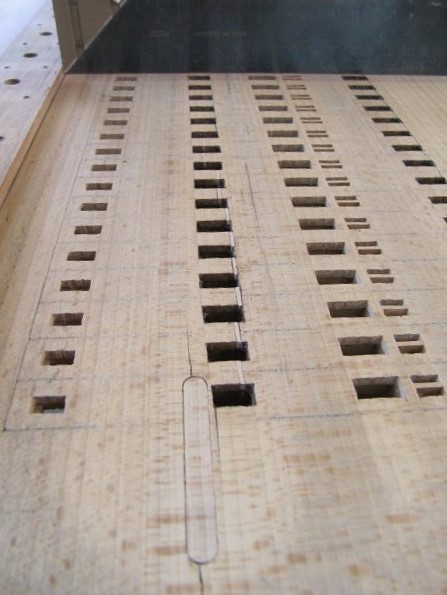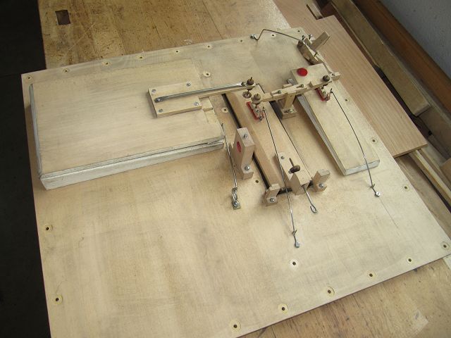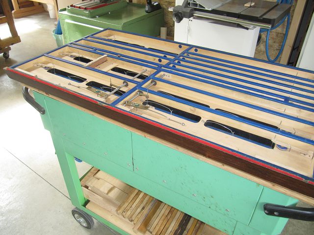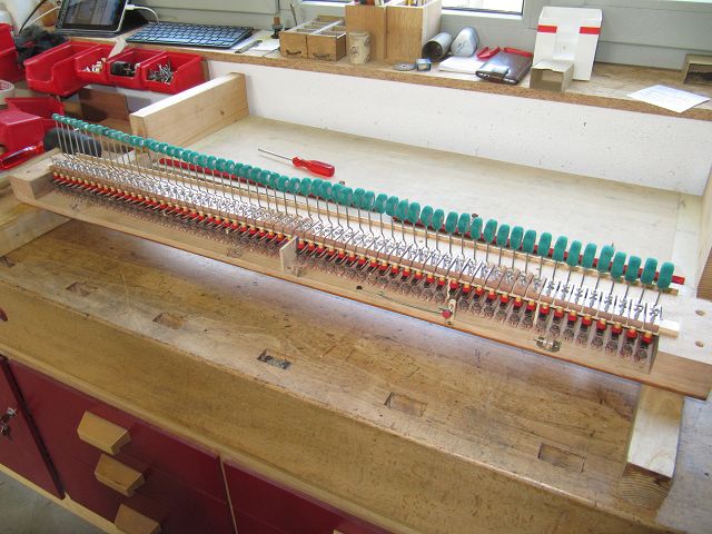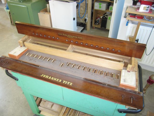 Nachdem nun alles dicht war, ging es mit der Klaviatur weiter. Im Bild liegt der Rahmen mit Waag- und Führungsstiften schon auf.