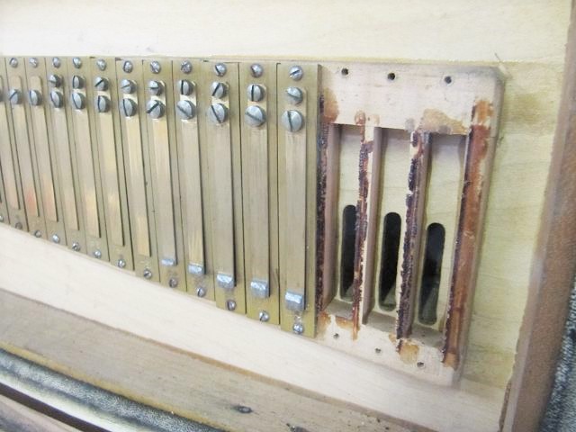 Hier sieht man die Trakturbahn samt Mitnehmer des Hauptwerkes, noch ohne Harmonium. Davor sind Schallöffnungen (im Notenpult) zu erkennen.