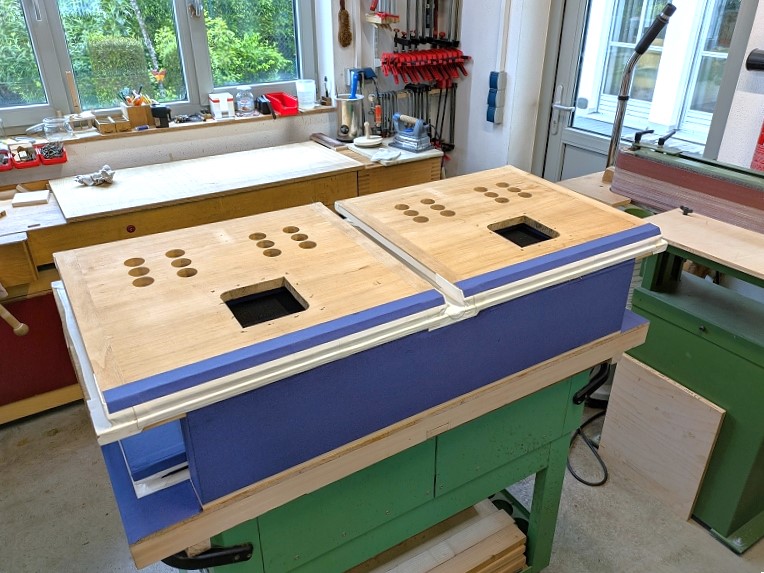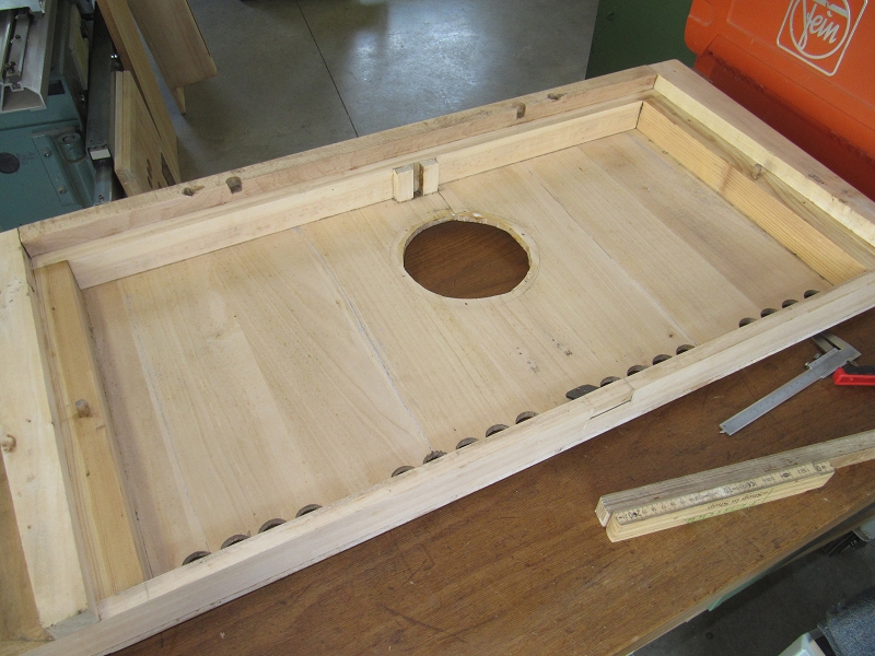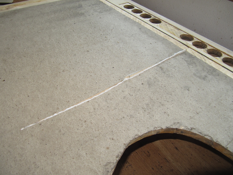 Da der Windkastenboden quer zur Längsrichtung verleimt ist, ist die Rissgefahr sehr hoch, zumal die Papierung nur einseitig (Unterseite) war.