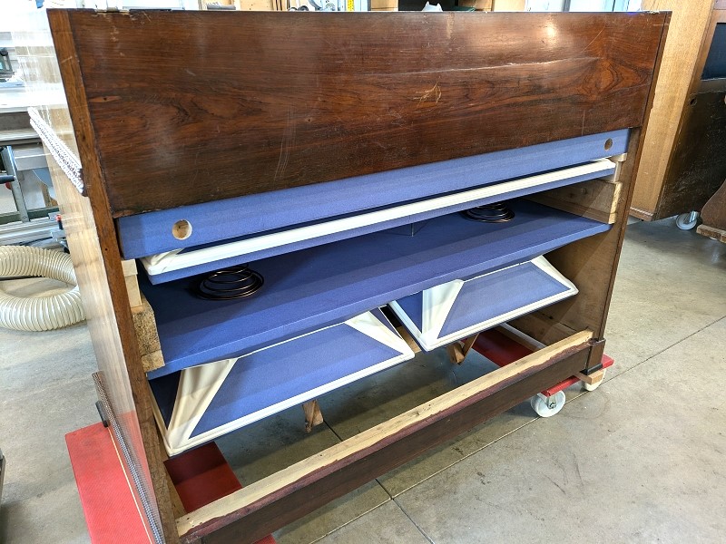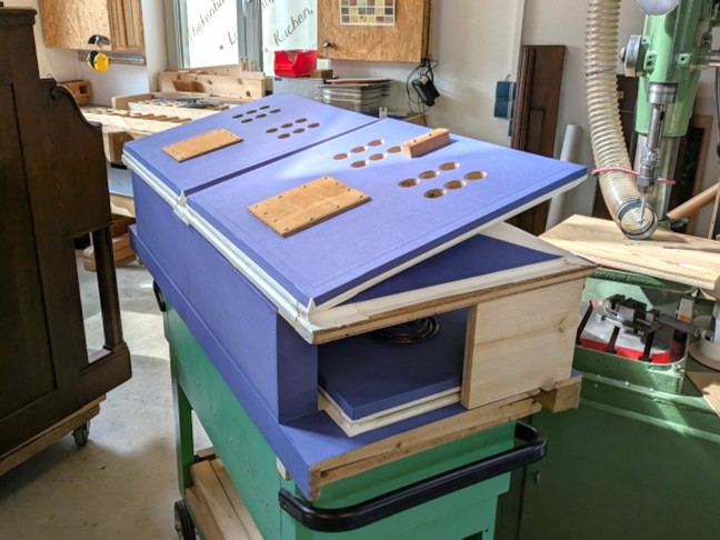 Da die Stärke der alten Dichtung keine Aussagekraft hatte (andere Balgpostion), musste das Maß neu ermittelt werden. Im Bild sieht man die Diskanthölzchen in den Ecken, welche das Registerbrett zum Probeeinbau auf Höhe brachten.