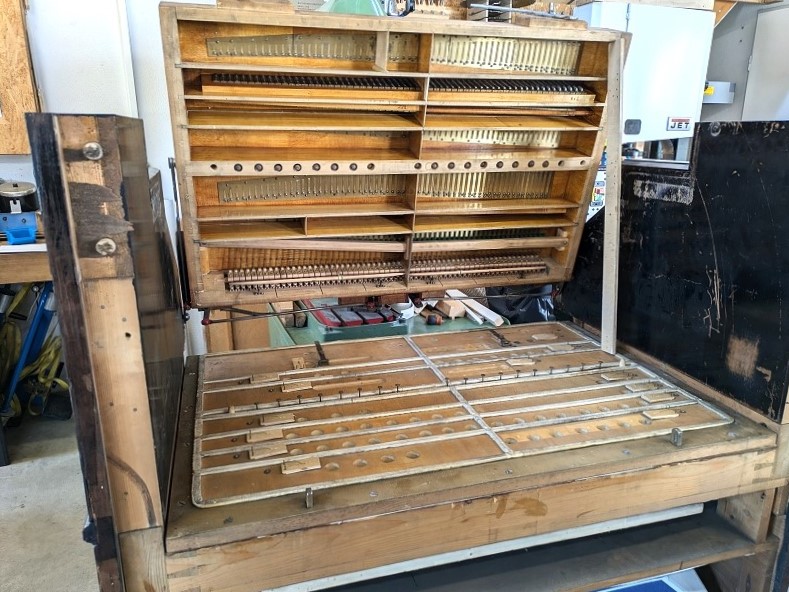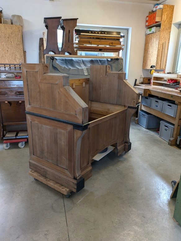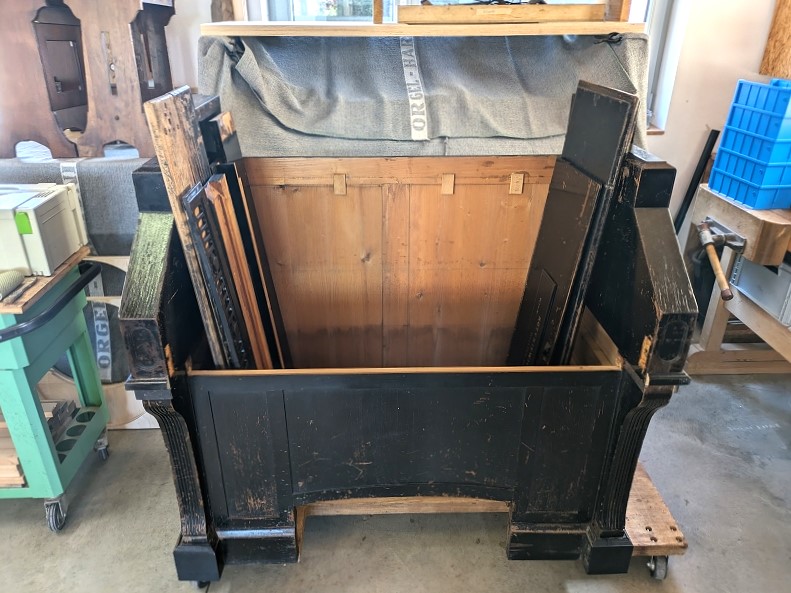 Am Anfang steht immer die Bestandsaufnahme. Je länger ich mich umsah, desto länger wurde die Mängelliste. Hier sieht man auch gut, dass das Instrument einmal bis zum Magazinbalg im Wasser stand.