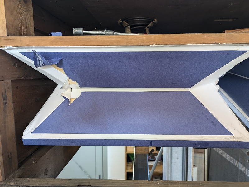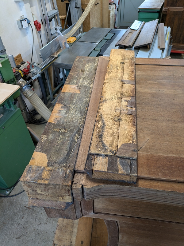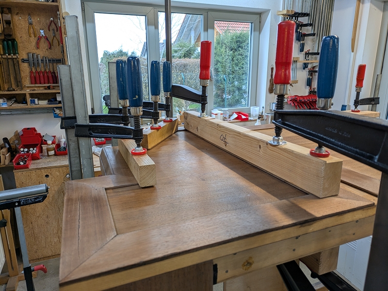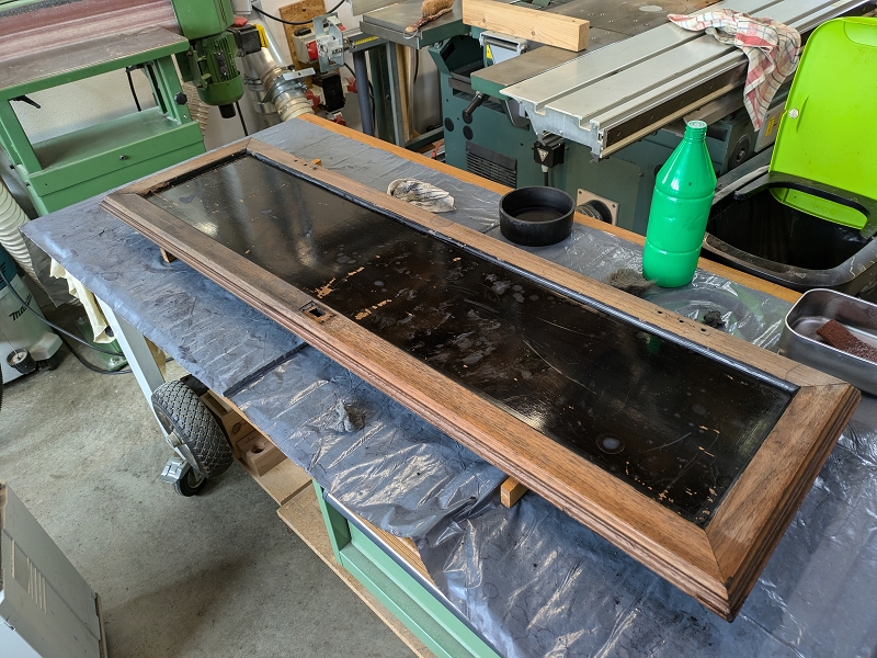 Die aufgeleimten "Rahmen"-Teile hatten sich durch Feuchtigkeit aufgestellt. Der Versuch sie mit viel Weißleim wieder anzuschmiegen misslang.