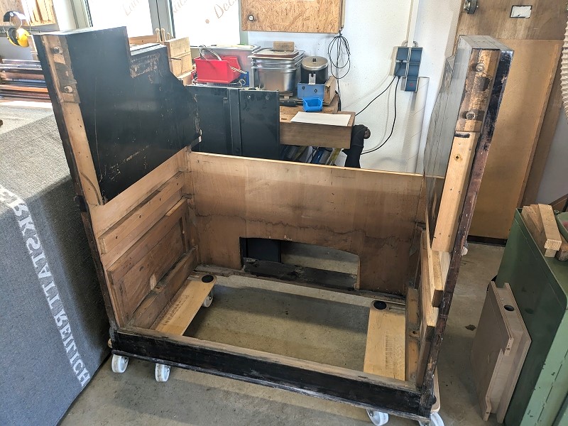So machte ich mich mit Spachtel, Stemmeisen, Spiritus und Stahlwolle ans Werk, den schwarzen Schellack zu entfernen. An einigen Stellen kam schönster Nussbaum zutage.