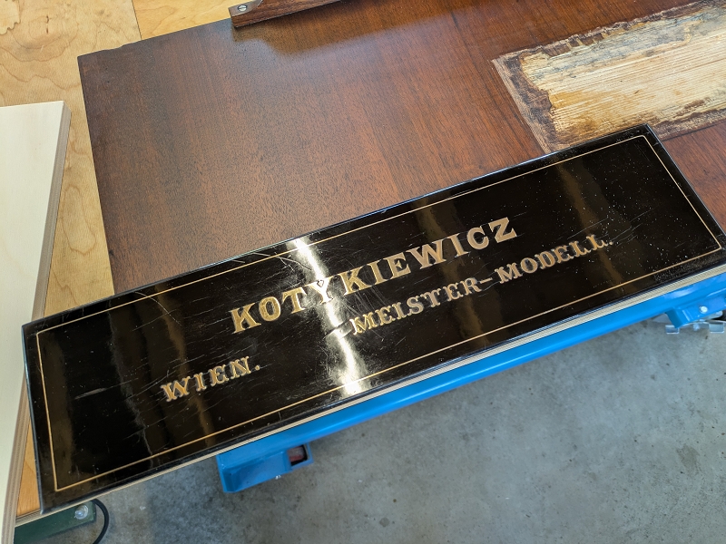 An der vorderen Bodenleiste wurde das fehlende Furnier gergänzt.