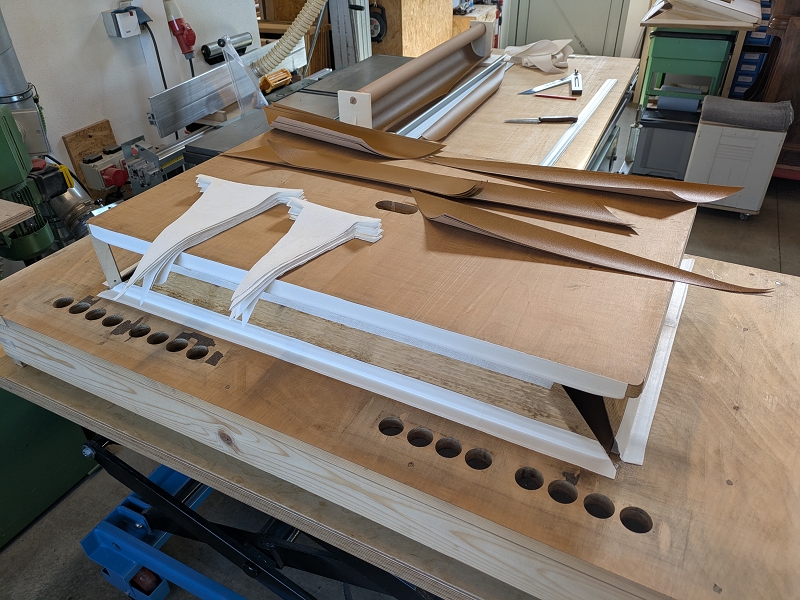 Zwei lange Furnierbahnen wurden zugerichtet und zusammengehängt, dann